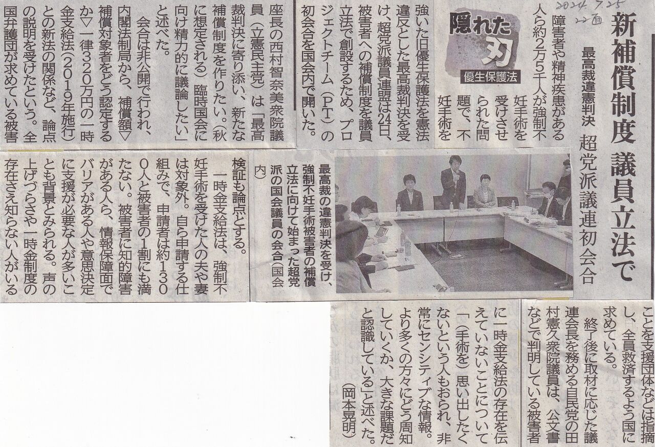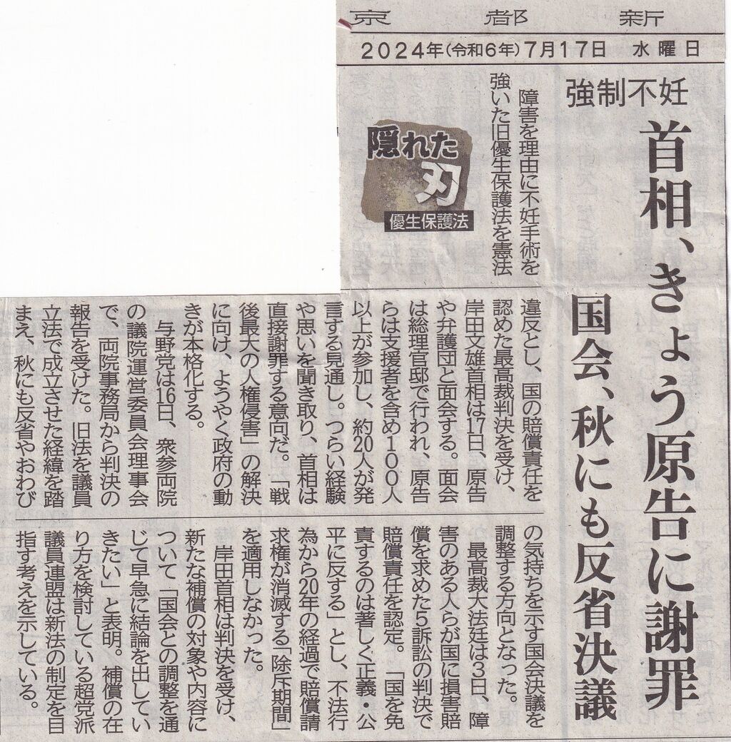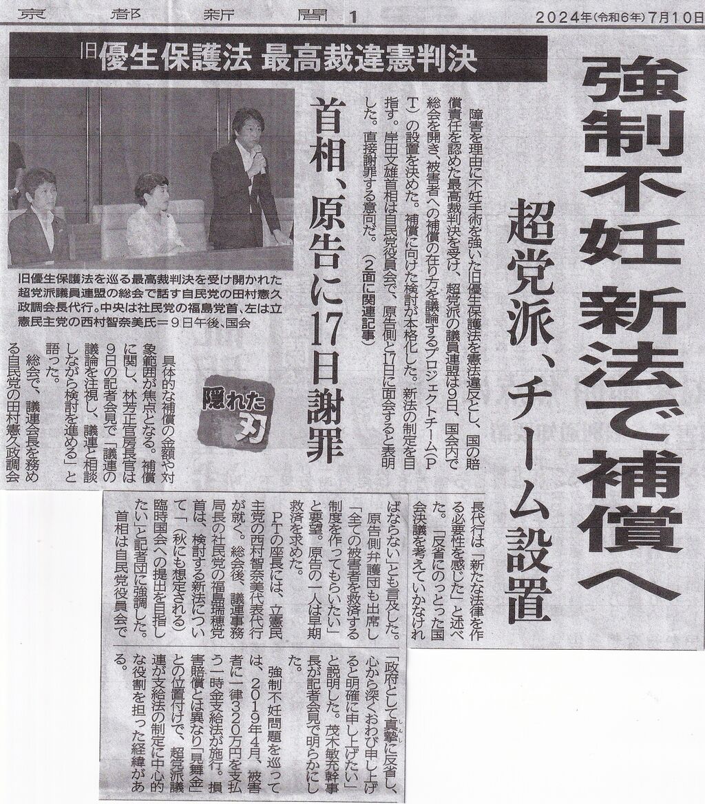 これは7月25日付け。文末の「(手術を)思い出したくないという人もおられ」の一言に心がグサッとしました。どんなに悲しくて、悔しくて、辛かった人生かと思い、少しでもそれを慰めることに繋がれば良いのにと素人考えでいたことを恥じました。それ以上に「思い出したくない」という感情が優先する人もおられるのですね。国は長い間誤った優生思想のもと、不妊手術を強いてきたのです。二度とこのようなことが繰り返されないよう、真摯に反省し、教育現場はもとより、様々な機会をとらえて世の中全体で払しょくするよう努めていかねばなら良いと強く思います。