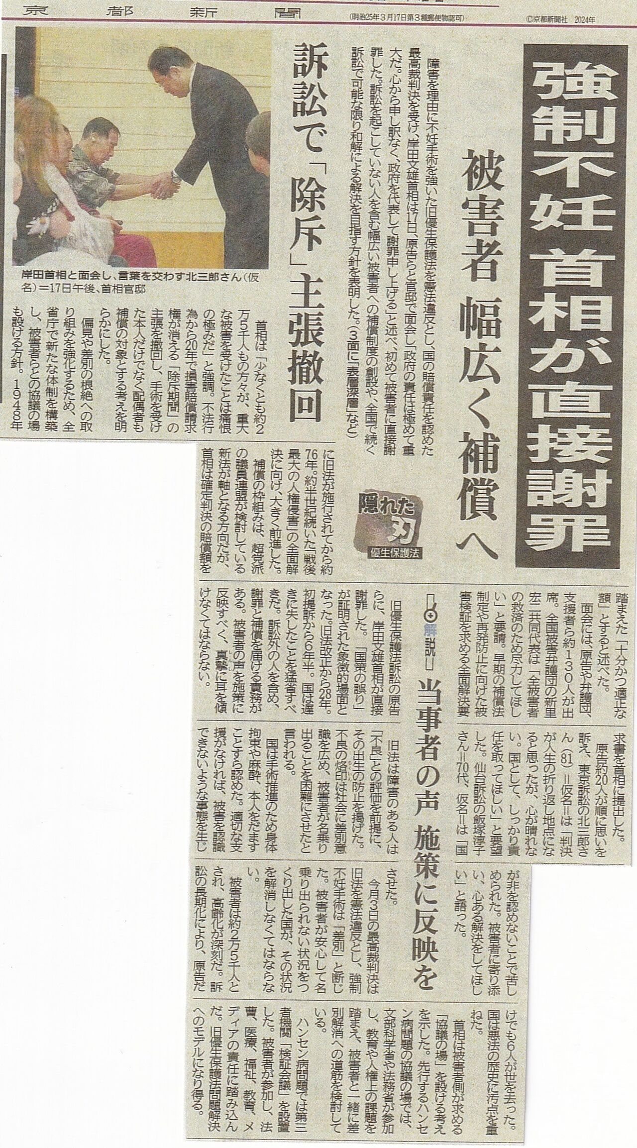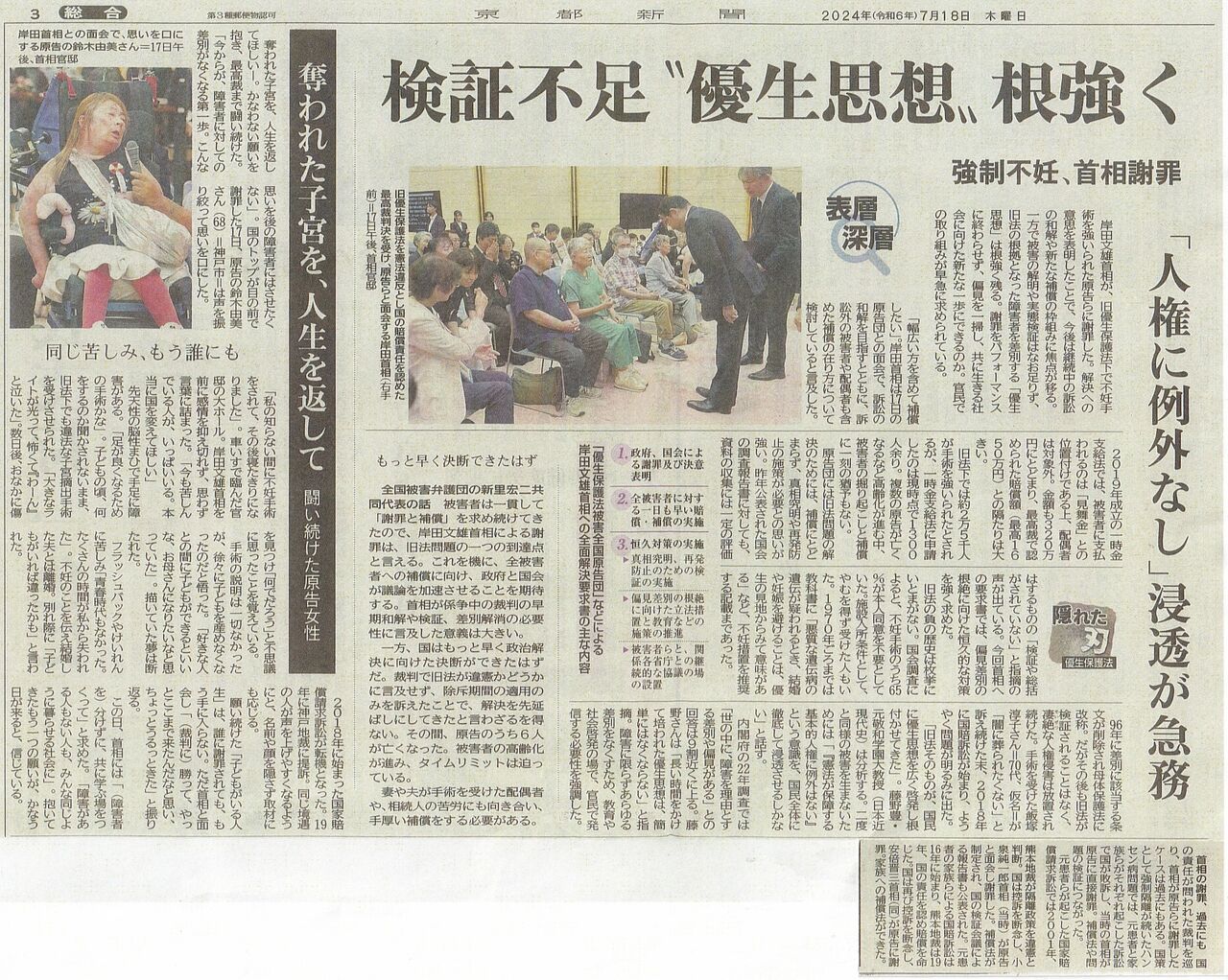 7月16日岸田首相が被害当事者の人々に直接謝罪したことを報じる7月18日付け1面記事。