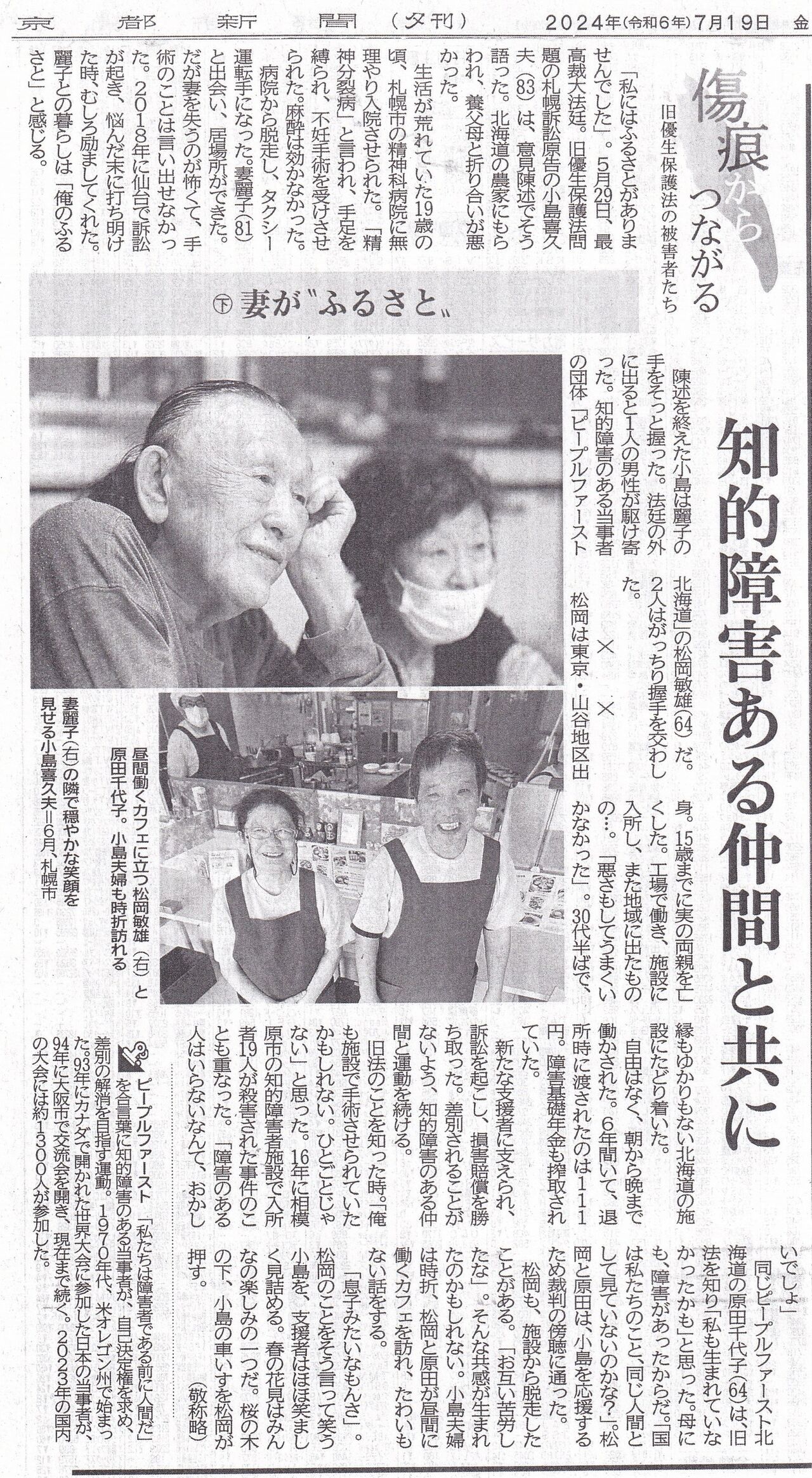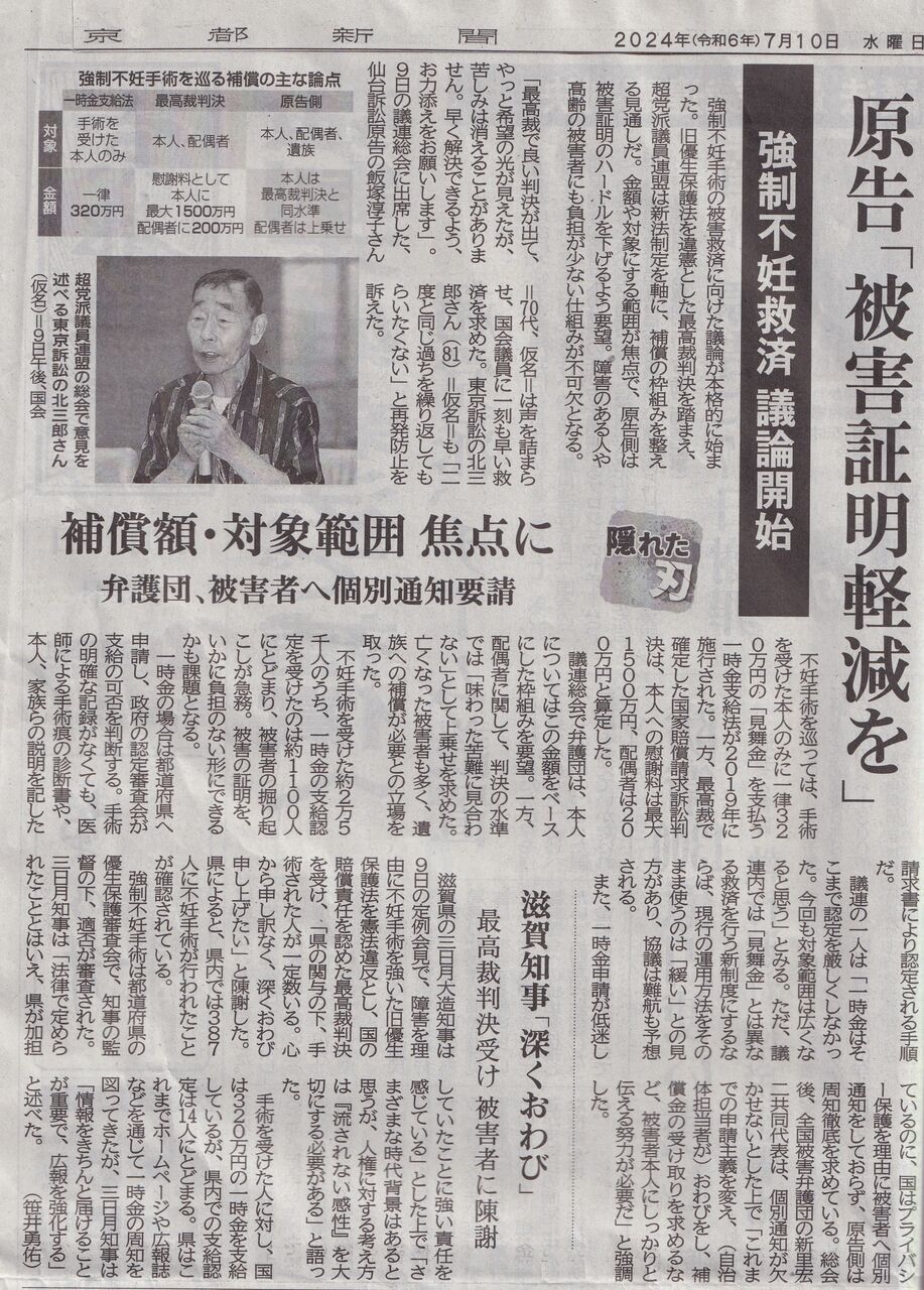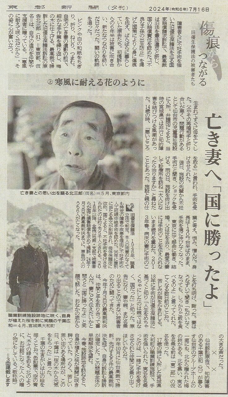 7月3日の画期的な最高裁判決以降の京都新聞の記事を貼り付けます。16日付け夕刊連載の初回で被害者のお一人で原告の北三郎さんの体験が紹介されています。