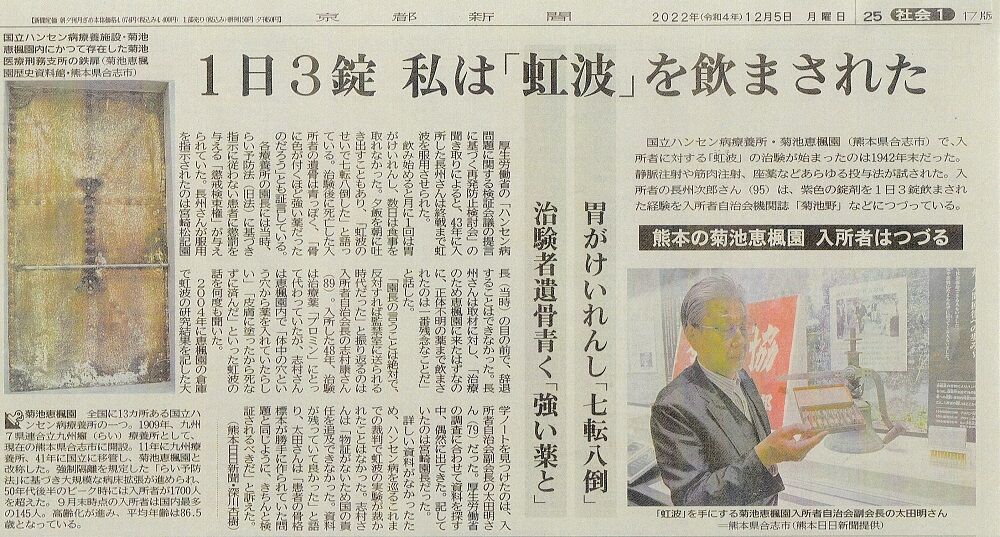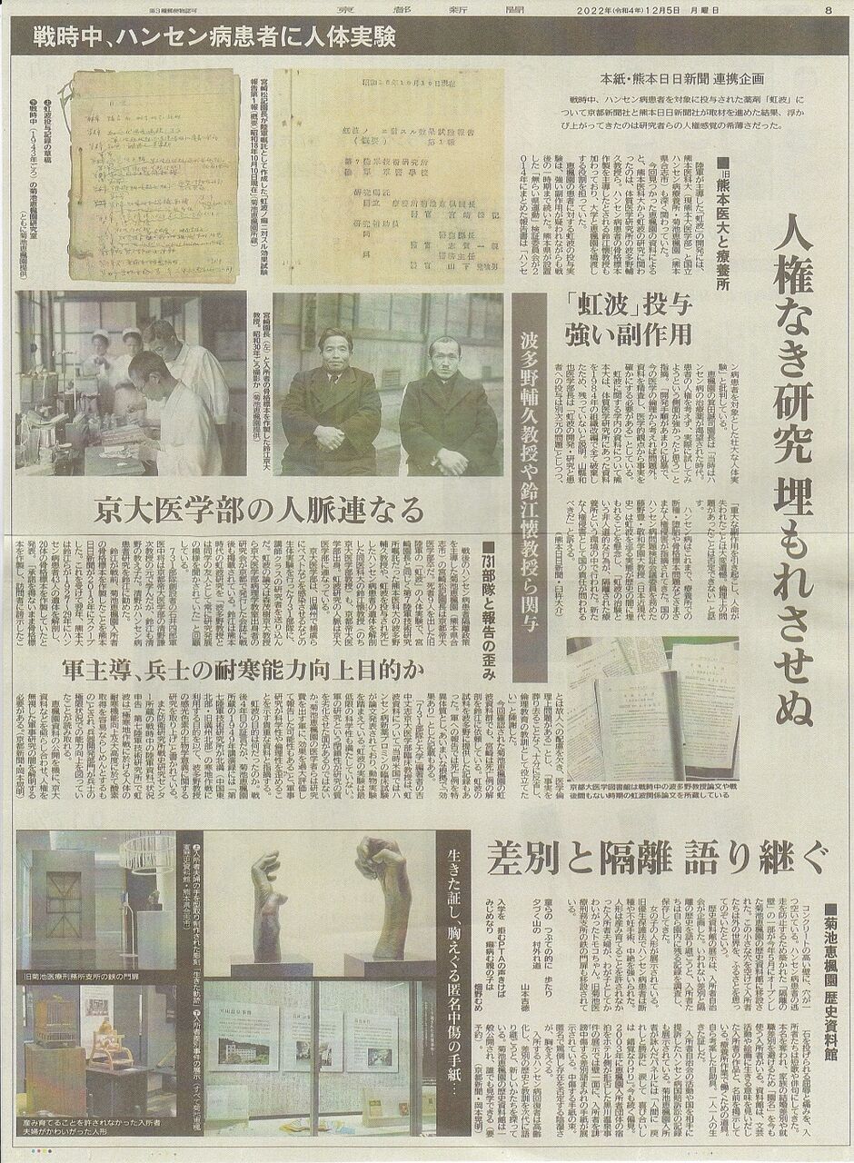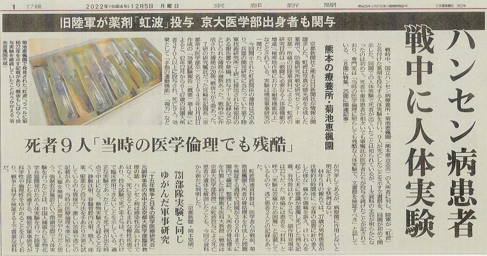 今朝の京都新聞の大きな扱いの記事です。執筆した岡本晃明記者は、これまでも陸軍731部隊が行ってきたことを調査して報道されていましたが、今回は熊本県合志市に今もある国立ハンセン病療養所・菊池恵楓園で行われていたおぞましい人体実験に関する報道です。上掲のように1面、8面に全面特集、社会面にわたって大きく載っています。熊本日日新聞は1面と12面に関連記事が載っているようです。
