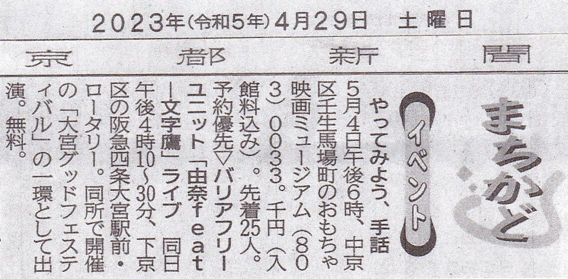 今朝の京都新聞「まちかど」で、5月4日に開催する第4回事業「やってみよう、手話」のお知らせを掲載して頂きました💗