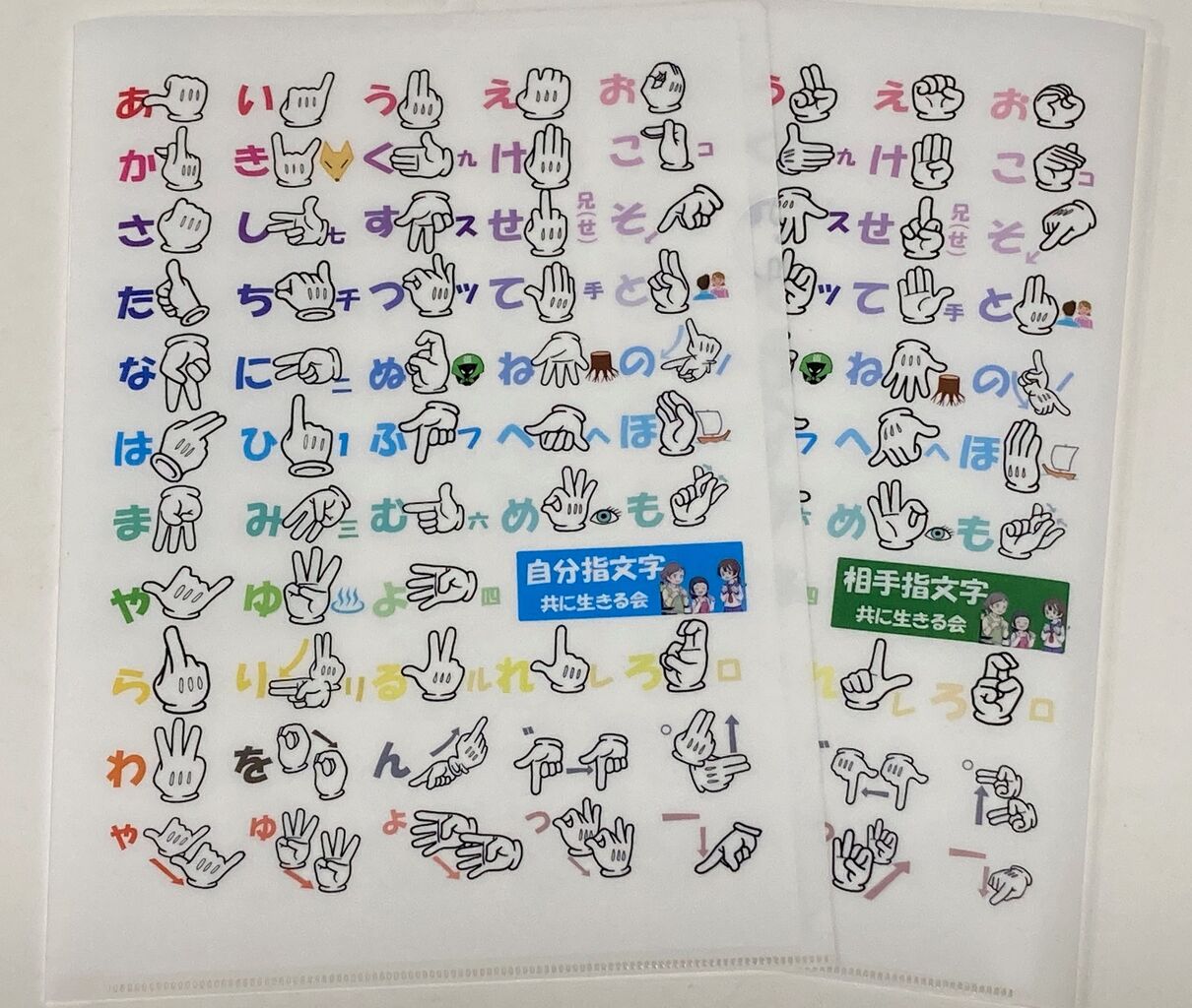 友達の西岡りきさんにデザインして貰ったこの特製ファイルをテキストにして、手話通訳や聾者の支援をされている方、「由奈feat一文字鷹」さんの指導を受けながら、指文字の「あいうえお」を学び、新曲『手話あいうえお-明日は輝くさ-』を手話で表現できるようになったら良いですね。