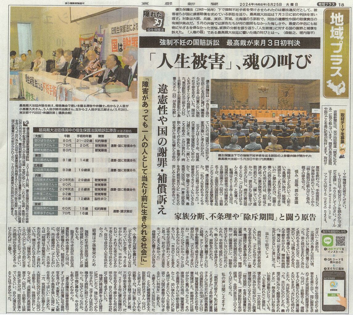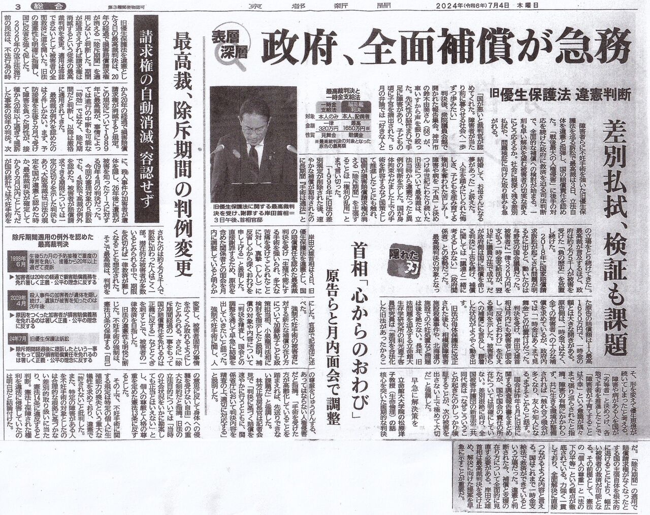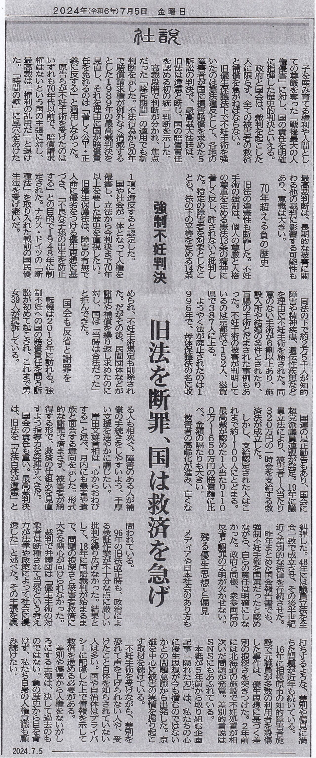これは7月25日付け。文末の「(手術を)思い出したくないという人もおられ」の一言に心がグサッとしました。どんなに悲しくて、悔しくて、辛かった人生かと思い、少しでもそれを慰めることに繋がれば良いのにと素人考えでいたことを恥じました。それ以上に「思い出したくない」という感情が優先する人もおられるのですね。国は長い間誤った優生思想のもと、不妊手術を強いてきたのです。二度とこのようなことが繰り返されないよう、真摯に反省し、教育現場はもとより、様々な機会をとらえて世の中全体で払しょくするよう努めていかねばなら良いと強く思います。