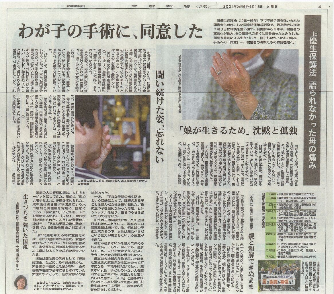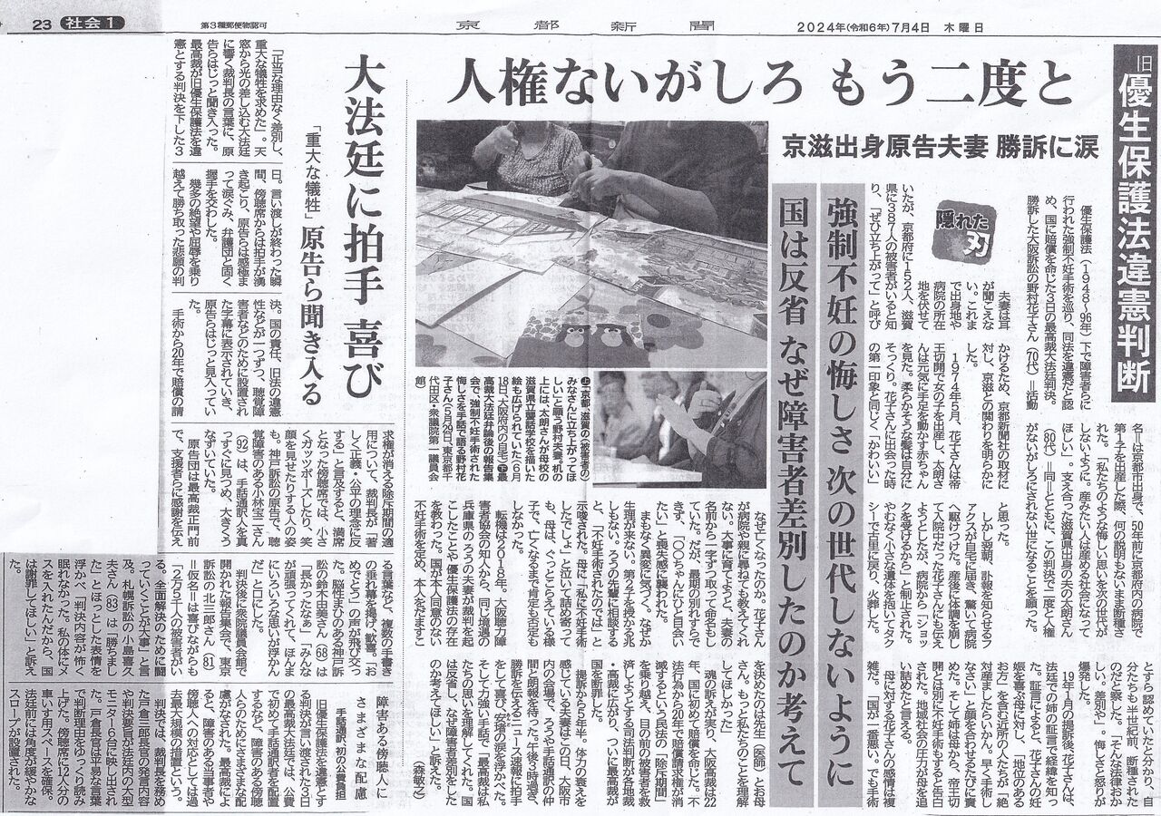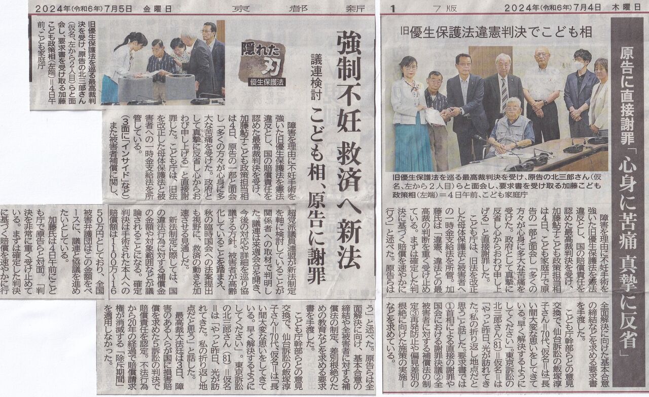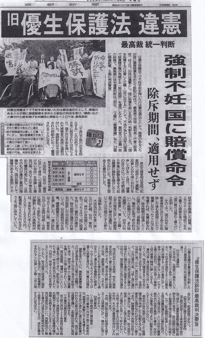 これは7月25日付け。文末の「(手術を)思い出したくないという人もおられ」の一言に心がグサッとしました。どんなに悲しくて、悔しくて、辛かった人生かと思い、少しでもそれを慰めることに繋がれば良いのにと素人考えでいたことを恥じました。それ以上に「思い出したくない」という感情が優先する人もおられるのですね。国は長い間誤った優生思想のもと、不妊手術を強いてきたのです。二度とこのようなことが繰り返されないよう、真摯に反省し、教育現場はもとより、様々な機会をとらえて世の中全体で払しょくするよう努めていかねばなら良いと強く思います。